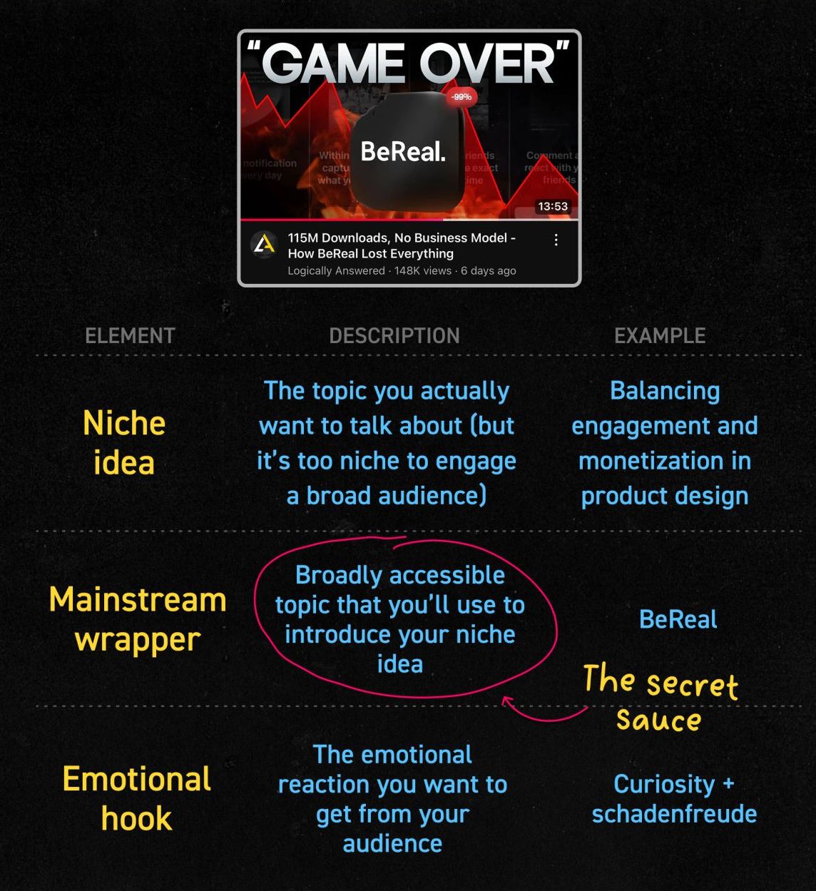 Example: How to monetize a B2C app without killing engagement. That would do fine on LinkedIn with an audience of product managers, but it's waaaaaay too technical and dry for YouTube.