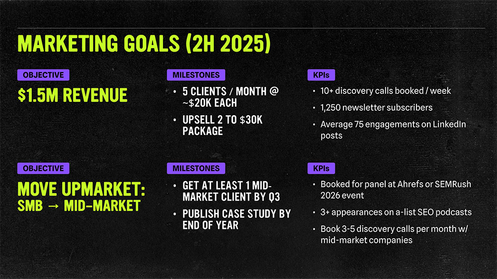 Take the above and turn them into clear revenue goals, with corresponding KPIs for the rest of the funnel: LinkedIn engagement, website traffic, newsletter subscribers, discovery calls booked, etc.